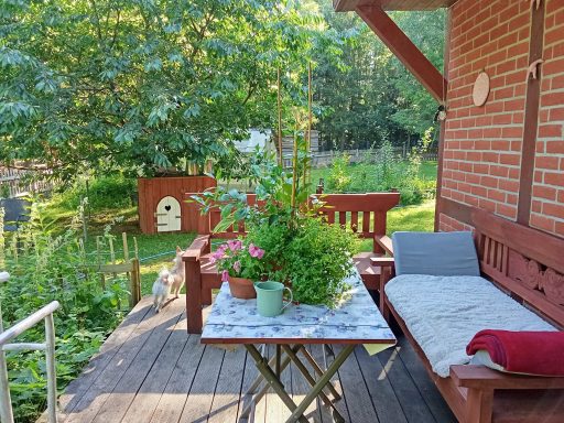 Auf die Mülltrennung mit Bio Kompost. und die Trennung der WC mit chem. Zusatz wird Wert gelegt. Ökologische Nutzung ist gern gesehen. Der Kompost wird in den Natur Kreislauf gegeben zusammen mit Laubmulch.